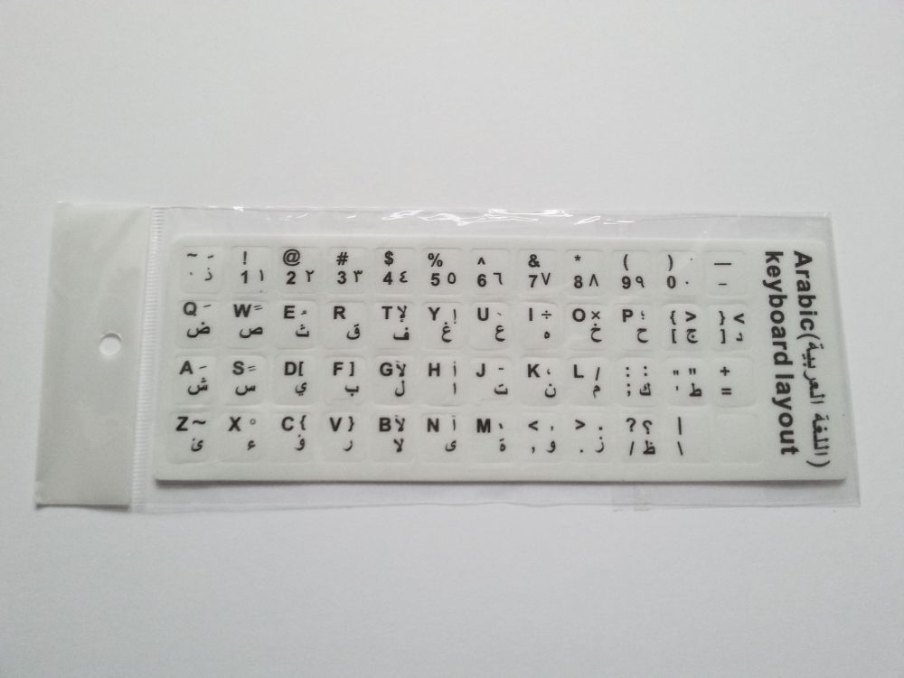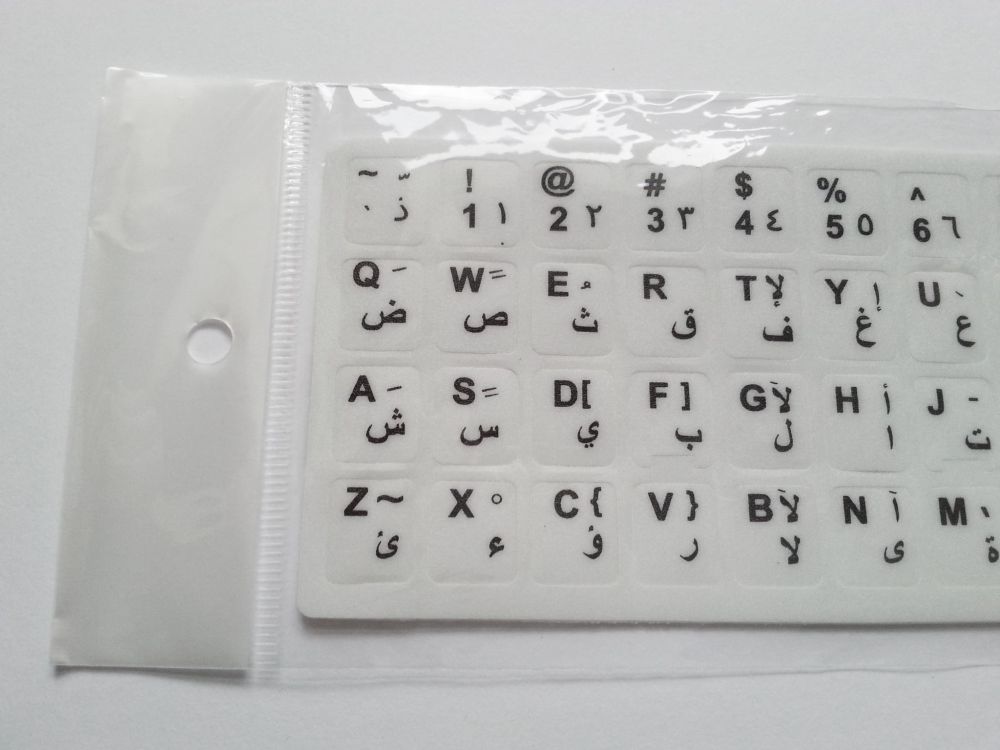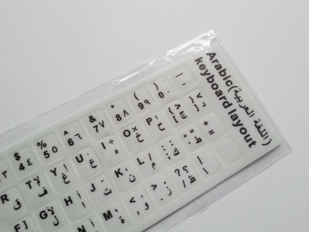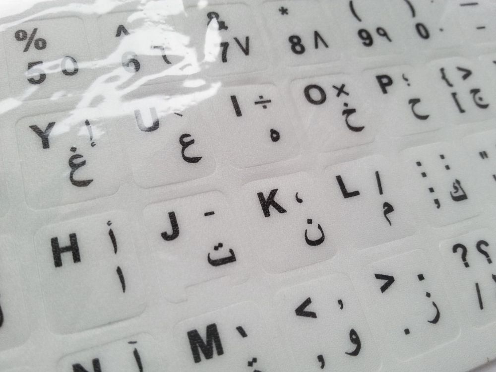 Modernise your device with durable white stickers that merge Arabic and English characters for a fresh, versatile look.