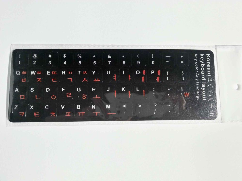 Experience dynamic typing with durable black stickers accented in red-orange, blending Korean and English keys with striking style