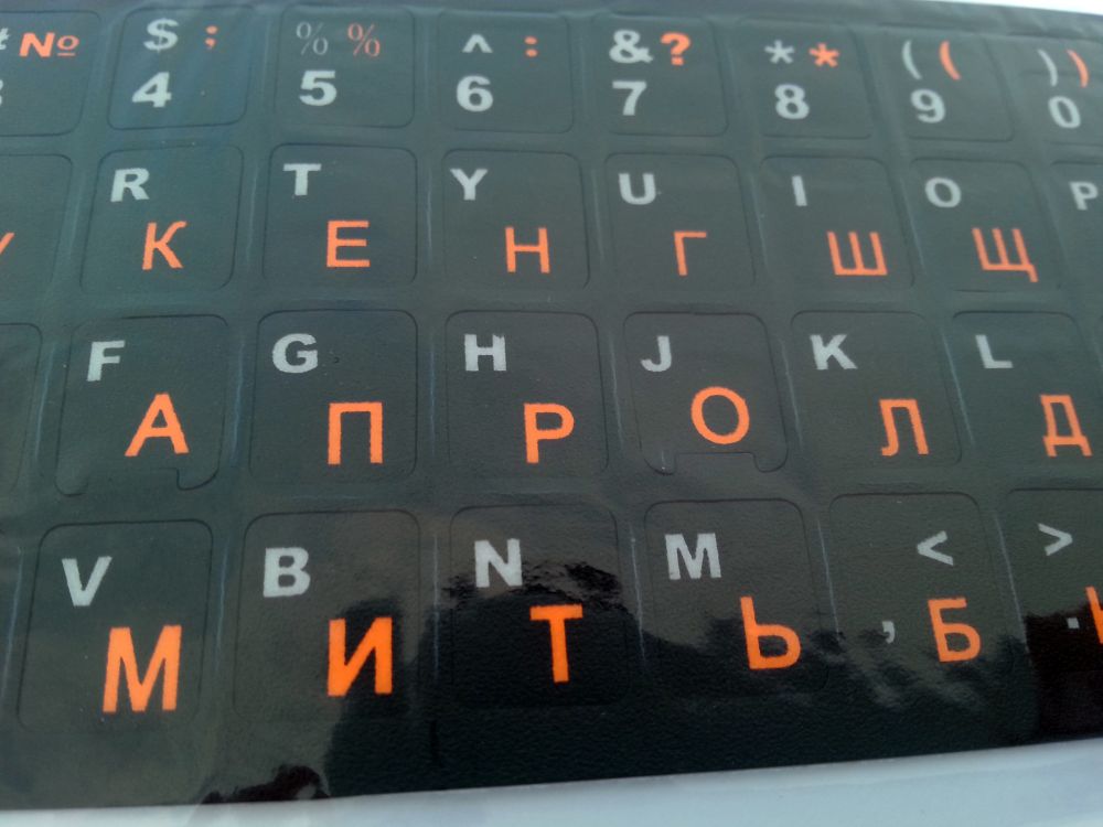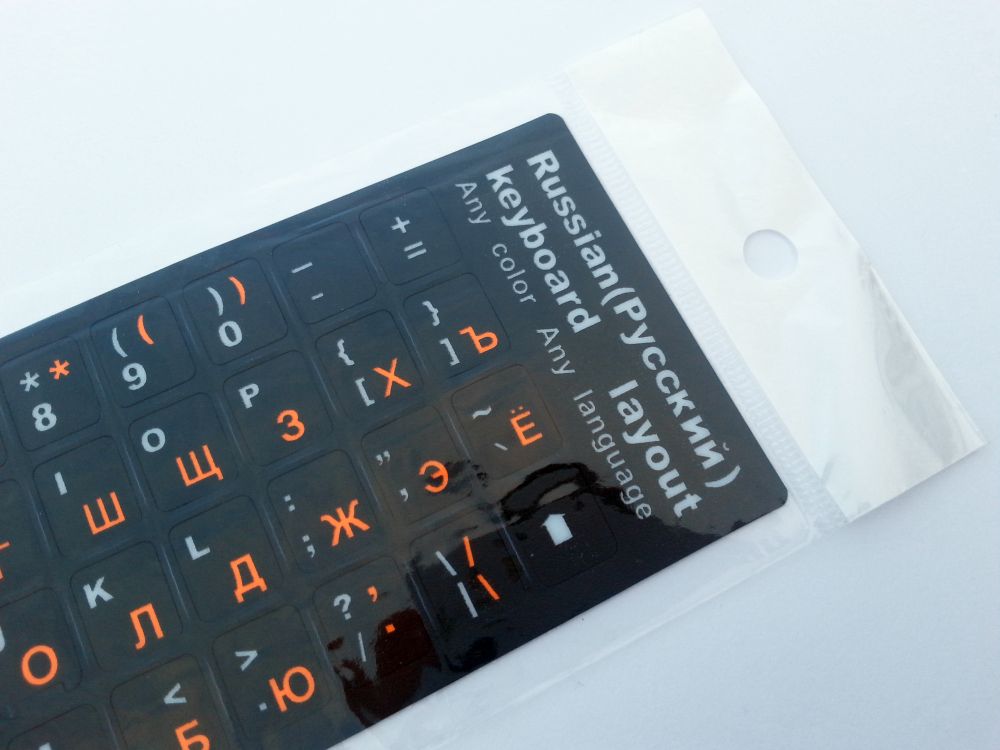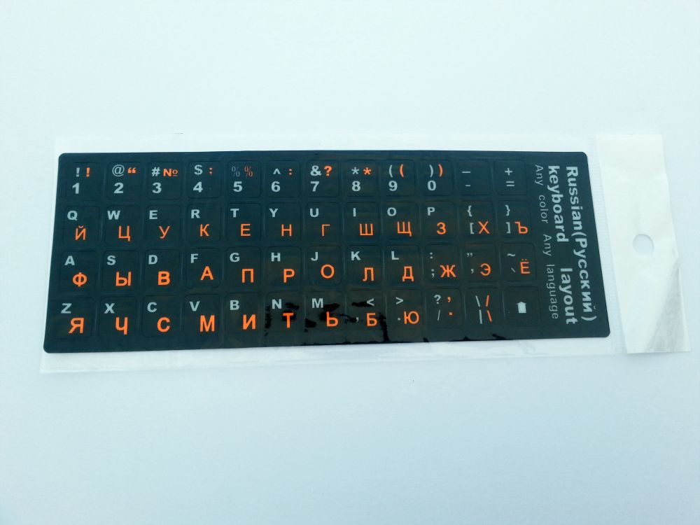 Revitalise your keyboard with durable black stickers accented in orange, blending Russian and English characters effortlessly.